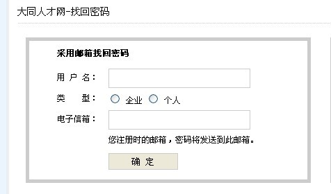 請(qǐng)輸入 用戶名 和當(dāng)初注冊(cè)的郵箱.特別注意,選擇好,企業(yè)和個(gè)人,企業(yè)就是招聘單位,個(gè)人就是求職者 填寫(xiě)完畢 點(diǎn)確定 就可以了,如果這個(gè)方法不好用 可以用下一個(gè),.