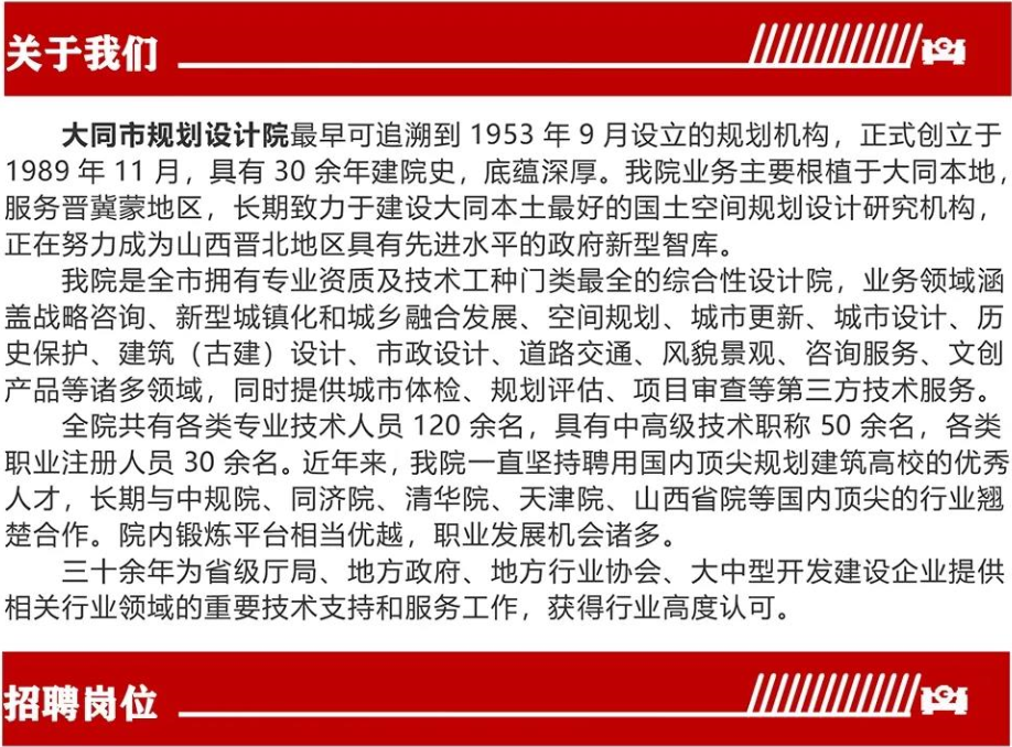 大同市規(guī)劃設(shè)計院,成立于1989 年11 月。是大同市城鄉(xiāng)規(guī)劃局下屬的全民事業(yè)單位,是以城市規(guī)劃為主體的具有城市規(guī)劃甲級資質(zhì),市政公用行業(yè)乙級資質(zhì),建筑工程設(shè)計乙級資質(zhì)、工程咨詢丙級資質(zhì)的綜合性設(shè)計院。